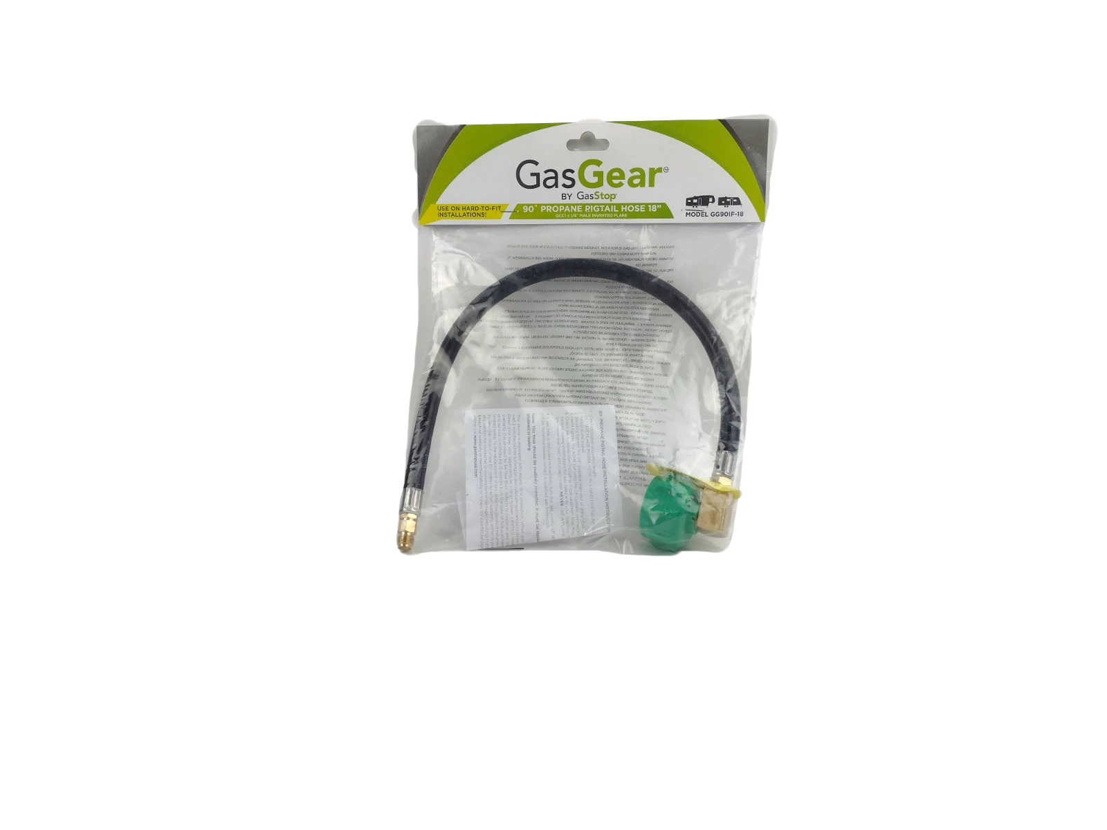GasGear by GasStop in neoprene rubber 90 degree hoses feature a robust brass 90 degree fitting to reduce hose stress caused by sharp curves and rubbing damage. When your ready to put your propane cover on (after you have added the GasStop valve) and it doesn’t fit, Hmm. You might be looking at why? The GasGear pigtail 90° hose accessory will do the trick. It’s perfect as a replacement piece or use with the GasStop valve. You will be amazed how the propane cover fits, without having to mount the tank and the safety valve sideways . Just replace the GasGear pigtail hose, and you can rest assured you have the propane solution for your next adventure in the RV!