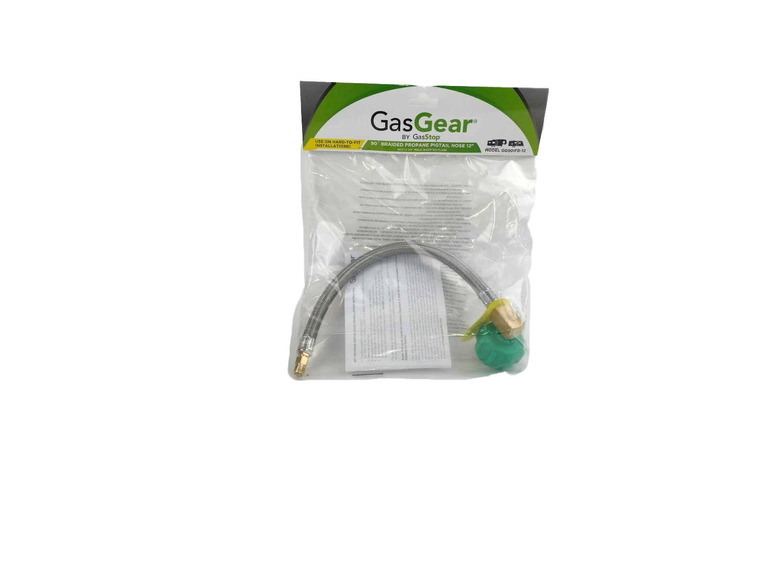 GasGear by GasStop in braided stainless steel 90 degree hoses feature a robust brass 90 degree fitting to reduce hose stress caused by sharp curves and rubbing damage. When your ready to put your propane cover on (after you have added the GasStop valve) and it doesn’t fit, Hmm. You might be looking at why? The GasGear pigtail 90° hose accessory will do the trick. It’s perfect as a replacement piece or use with the GasStop valve. You will be amazed how the propane cover fits, without having to mount the tank and the safety valve sideways . Just replace the GasGear pigtail hose, and you can rest assured you have the propane solution for your next adventure in the RV!