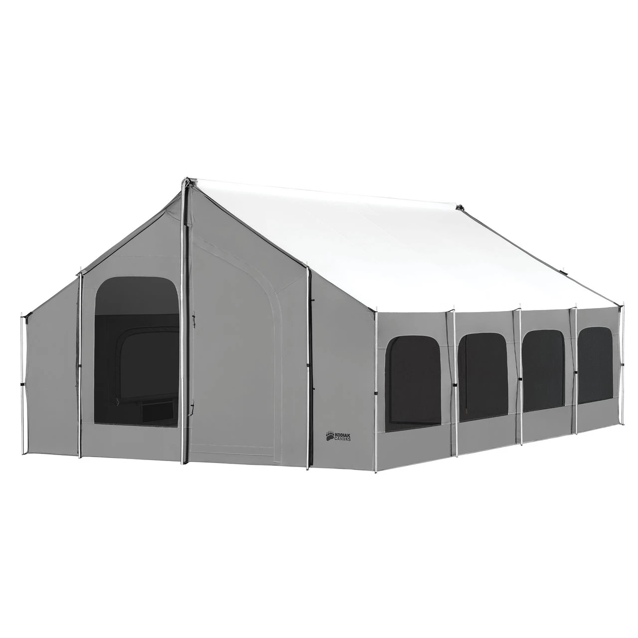 The 12×16 Cabin Lodge SR is Kodiak Canvas largest tent. It combines watertight Hydra-Shield™ 100% cotton canvas with a 13.5 oz. vinyl floor & welded seams, plus two 7.5 ft. tall doors & 9 large windows with no-see-um mesh. Zippered YKK closures provide great airflow & protection. A 1-inch steel frame & stove jack keep it standing strong even in wind & snow. The 8×8 ft. enclosed awning accessory (sold separately) adds space & protection. Comes with a storage bag & 12″ steel stakes. 2 adults required for setup. Lifetime warranty.