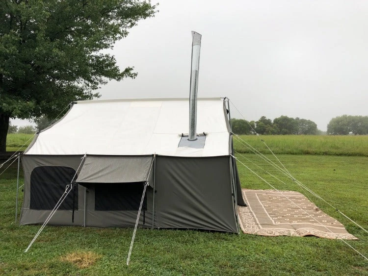 This design, boasting a frame with 1-inch, galvanized, steel tubing, will hold up to strong winds and even snow loads. A stove jack allows for use of a wood burning stove, so you can stay warm and cozy. The 8×8 ft. enclosed awning accessory (sold separately) increases the space by 44%, and provides a nice area to get out of the weather or store extra gear. A zippered storage bag and hefty, 12-inch, steel tent stakes are included. Requires two adults for setup.