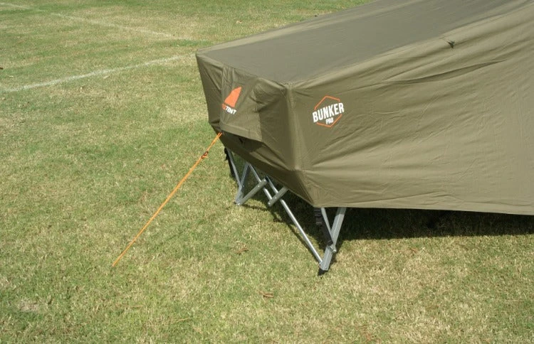 The NEW Oztent Bunker Pro is a cot bed and tent all in one! The best version of the Bunker ever released. The Bunker Pro features an 8oz Polycotton canvas material, the largest size available – after all, who doesn’t like extra space? The Bunker Pro is strong and sturdy, also with some great updates such as integrated guy rope pockets, replaceable mesh screens and extra reinforced cross leg frame structure while still maintaining the features you know and love – the Oztent Bunker Pro is fast and an easy setup by one person, internal padded bed for extra comfort, 330 lbs weight rating and 100% waterproof material.