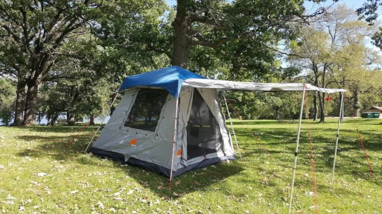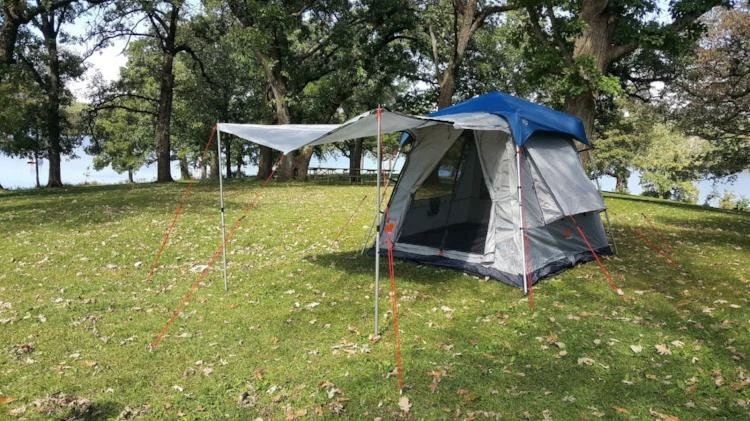Expand your Oxley 5 Lite tent living space with an attached front awning for shade or enclose the space under the awning by zipping on a one piece complete panel set that offers you privacy or by having the screens exposed for full ventillation.