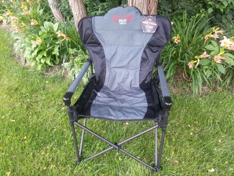 The Jet Tent pilot chair DLX is a deluxe version of the DX chair that’s a “sit” above the rest, from the two tone color polyester and twill fabric in the center area rated for 330 lbs, UV rays, the fabric clean up is better in most cases than your typical nylon camp chair, the wide arm rests are covered with a removable and washable twill fabric and individual replacement components make this portable camp chair a definate keeper, beings with most of the other portable chairs you’ll find don’t have the option to replace parts and can easily be tossed away for disposal, what you’ll find with the Jet Tent pilot DLX chair is once a part is replaced then your ready to sit comfortably again! Also, if you decide after the 5 year warranty is up, the seat area can be replaced and you virtually have a new chair! If your a person who enjoys an occasional wine while in the outdoors, don’t forget about our Jet Tent wine glass holder (exclusive to the Jet Tent chair series only) clips on just under the release handle on either side making it an accessory you don’t want to forget!