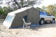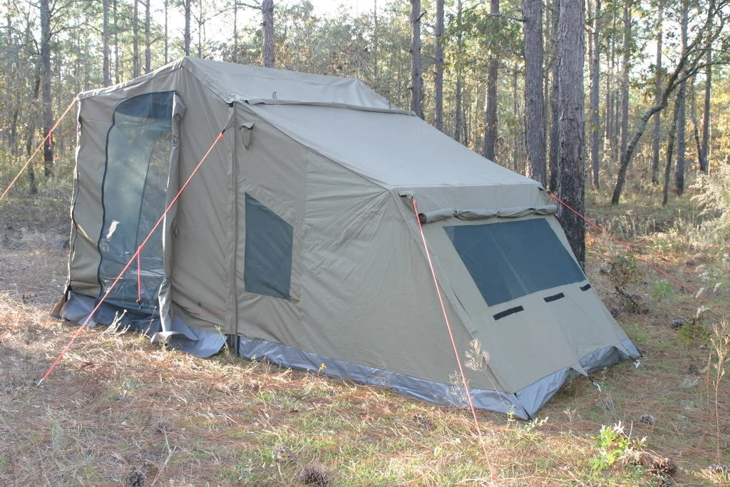 The deluxe peaked side panels are made of the same quality waterproof ripstop poly-cotton canvas blend as the tent, they simply zip to the awning and side of the tent, designed to give you extra privacy and wind protection while hanging out under the awning. The “peaked” design allows the rain to run off easier without having to lower the front poles or make adjustments to your set up. If your wanting ventillation then it’s as easy as rolling back the solid panels and leaving the zippered no-see-um mesh screens exposed on all three sides to create a screen room area, or simply zip the solid panels shut for enclosure, making this ideal for teardrop trailers as a place for changing, hanging out or a place to cook without the threat of the elements when backed under the front area.