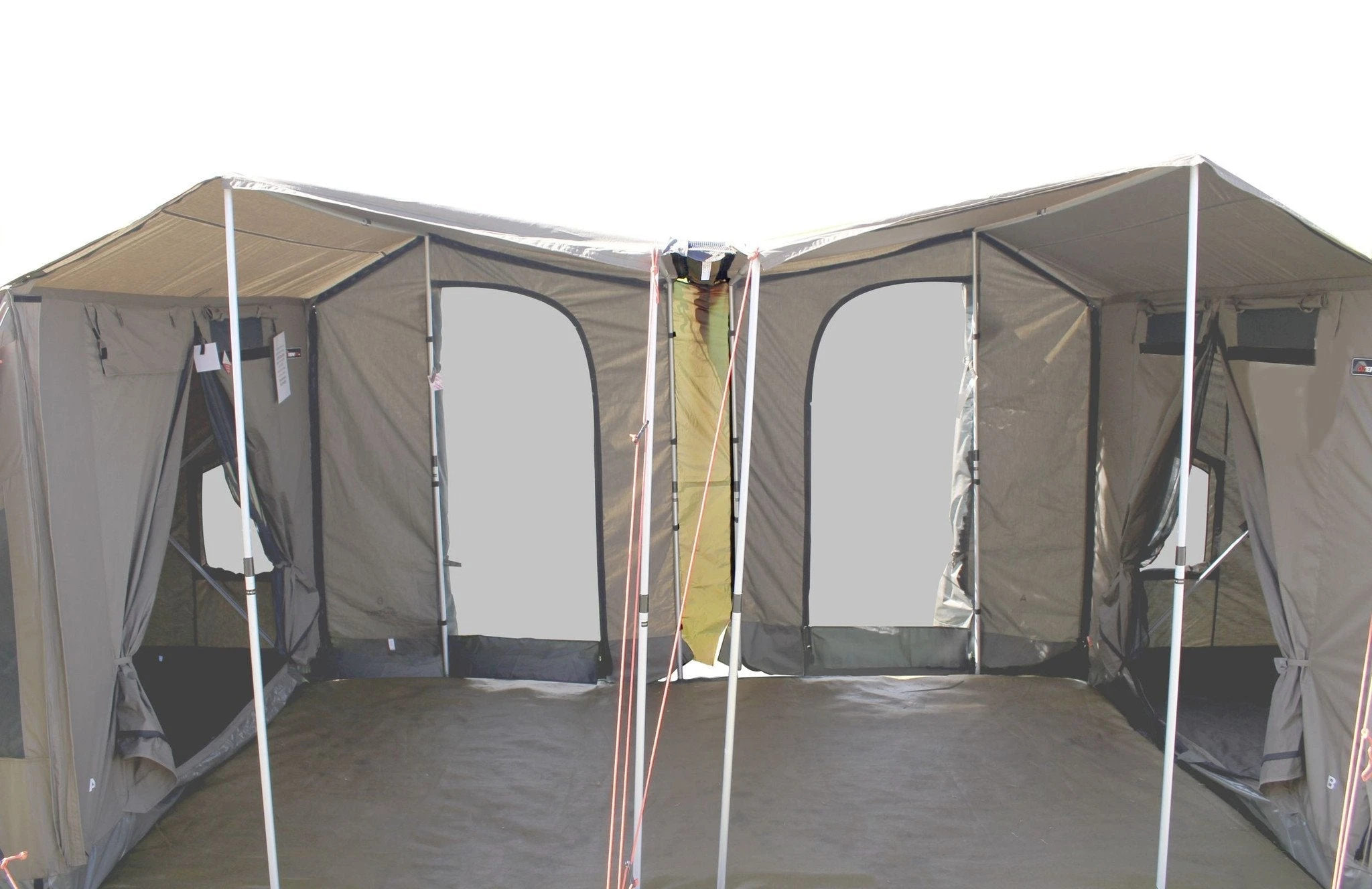 The Oztent RV Awning Connector allows you to zip two Oztents together awning to awning. This is beneficial when camping with a family because it allows you to have two separate rooms (one for the kids) with a large area in between for hanging out. Also, by combining the Deluxe Peaked Side Panels you will be able to enclose the awning areas. The awning connector also has an innovative gutter system to collect the water and funnels it down its own down pipe. The Awning connector also allows you to connect your Oztent to any of the Foxwing awning panel openings for a custom fit design.